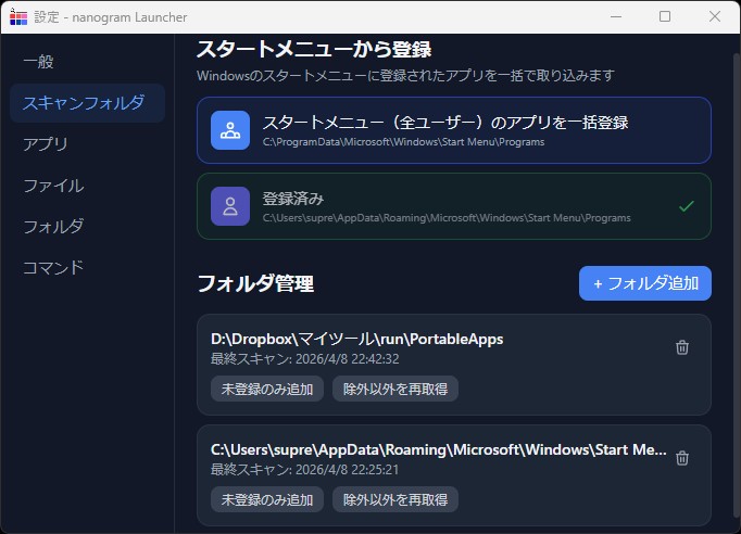 - スタートメニュー: スキャンフォルダ画面からワンクリックで一括登録
